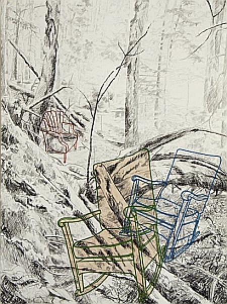 richly textured piece, a wide section of a blown-down tree with protruding branches takes on the